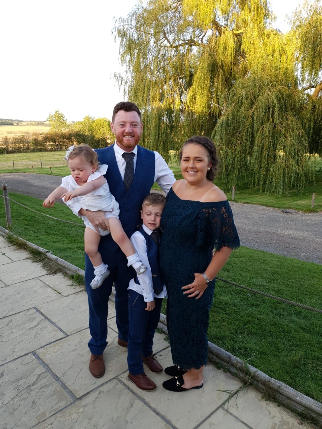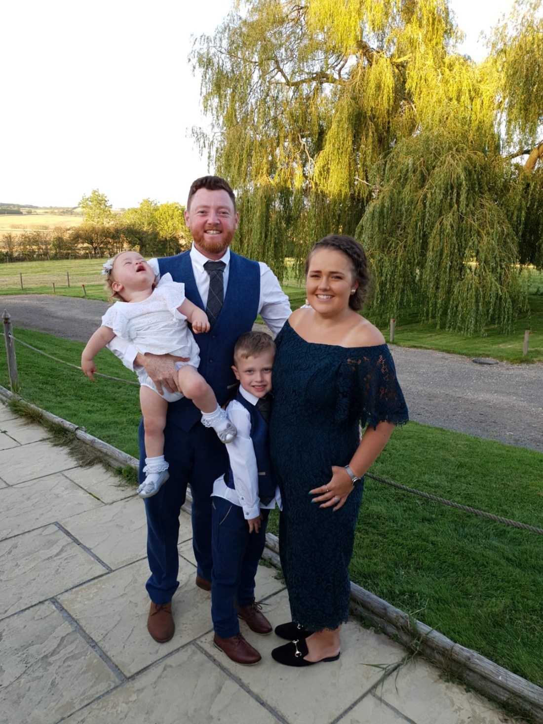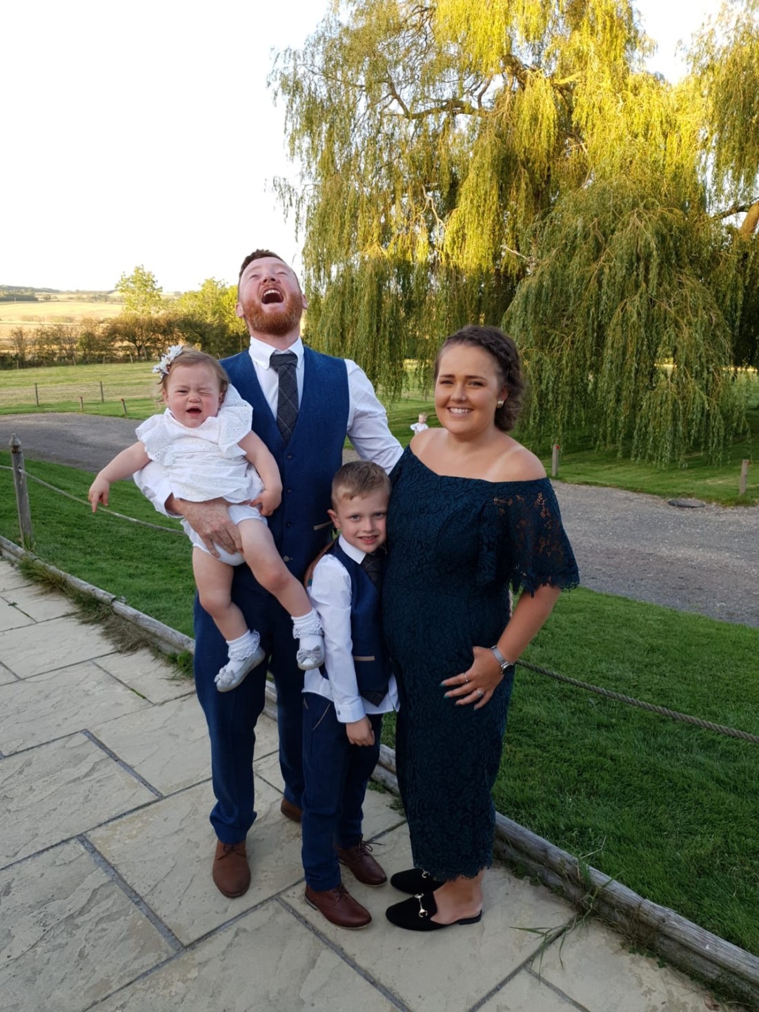 Photos are such a big part of the day and I was set on getting a lovely family photo of us 5, Sofia had other ideas. She wouldn’t get any photos which required her to stay still or be held for more than 3 seconds with us let alone the official ones. I can’t wait for my brother to receive all his photos and the big family photos not to feature Sofia as she had made a run for it before the photographer could capture it. Our attempt at a family photo of us 5 was never going to work as Max was asleep when we decided so we were off to a good start. They pretty much went like this,